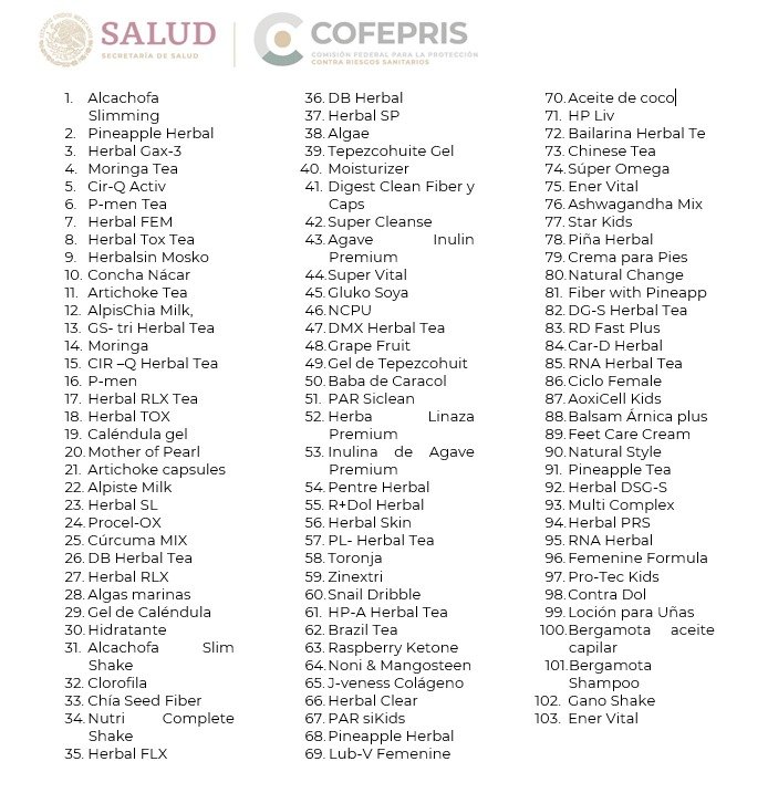 Sumado a lo anterior, Cofepris informa que estos productos contienen en su formulación ingredientes de origen sintético y natural que, combinados, pueden tener efectos perjudiciales para la salud e interactuar negativamente con medicamentos que estén usando o consumiendo los pacientes.